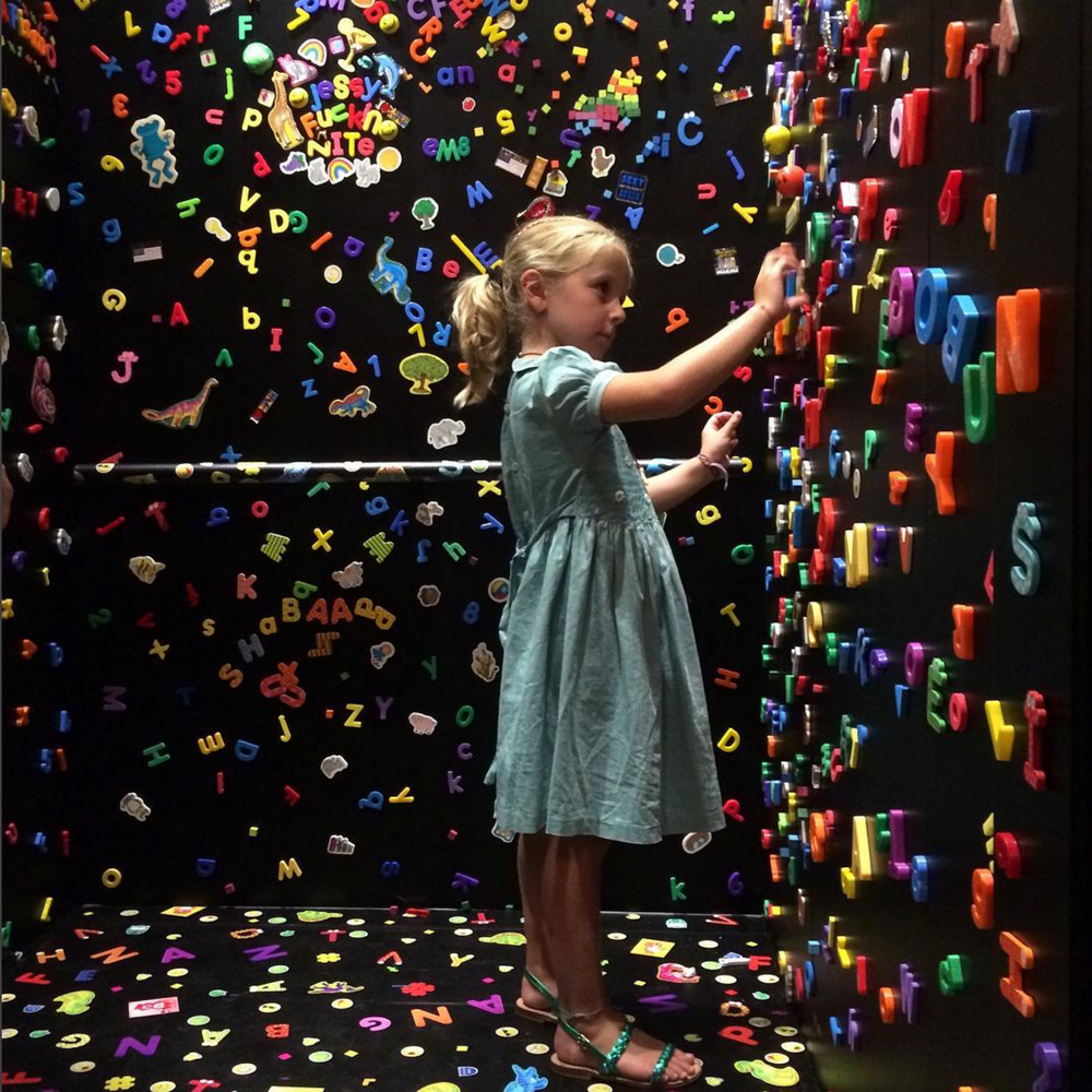 Typoe's first project with the Faena group, curated by Zoe Lukov and Ximena Caminos. Artists were invited to respond to an elevator inside the hotel. The entire interior was covered in iron to magnetize it, then filled with movable magnets of shapes and letters. Visitors can rearrange the pieces, write messages, and leave something behind for future riders. The work transforms one of the most uncomfortable transitional spaces in daily life into something playful and social, where communication with strangers, present and future, becomes the medium itself.