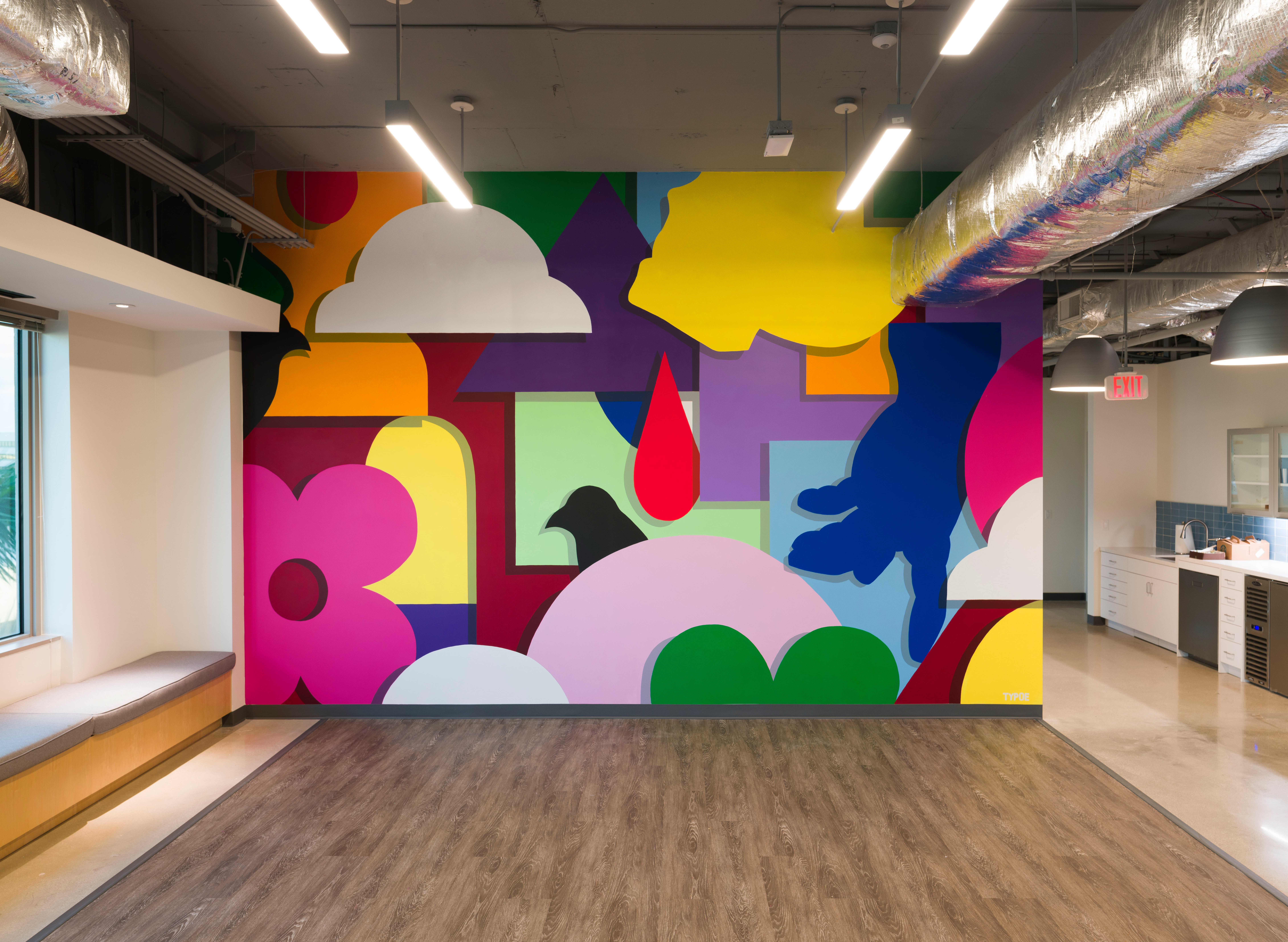 A mural for Windstar Cruises' new corporate office, designed to bring energy and movement to a clean, professional space. The composition uses color, shape, and a sense of motion to pull the eye across the wall, creating something that feels alive in a setting where people spend their daily working lives. The project later led to a twenty foot painting commission for Jazwares at their headquarters in Plantation, Florida.