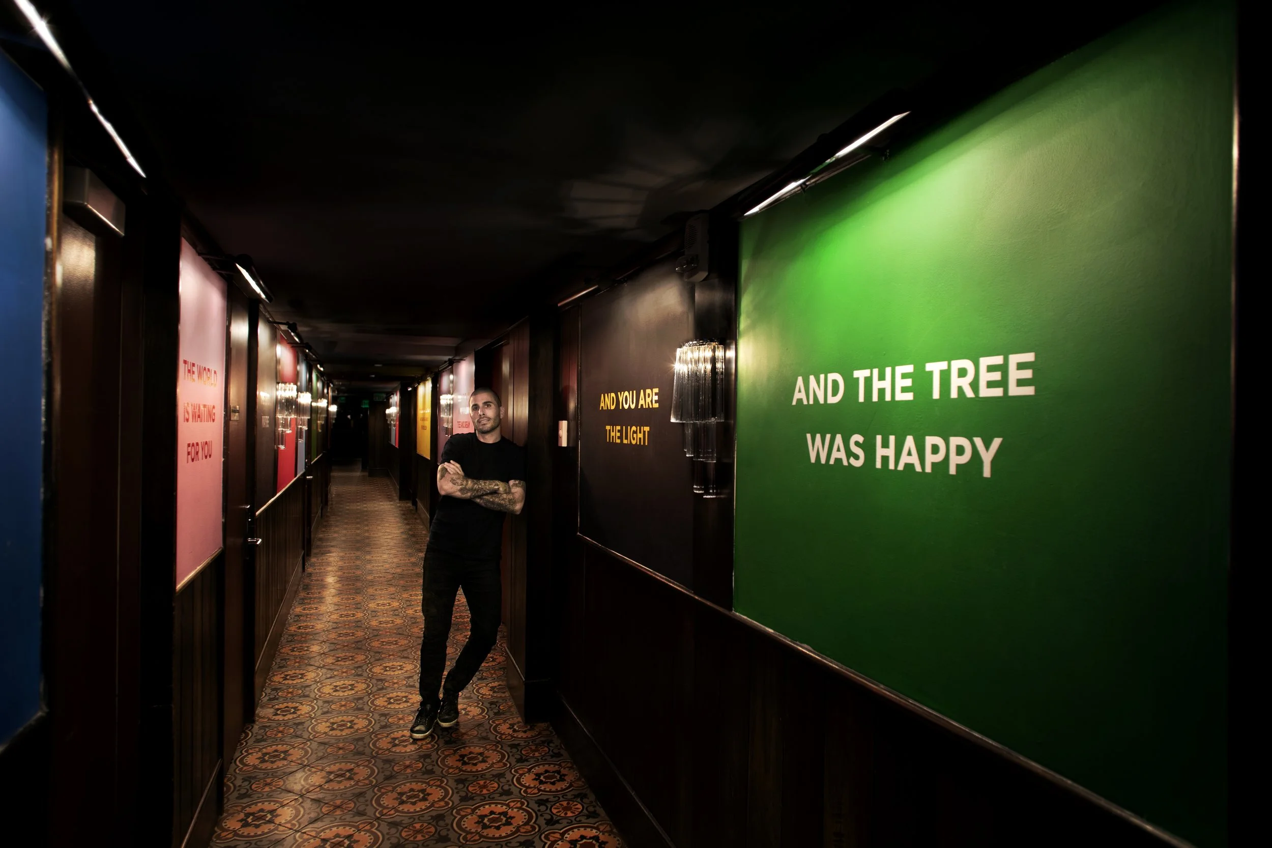 A site specific installation in one of the hallways at Soho Beach House, born from studying children's books and becoming fascinated by the last sentence of every story. The moral. The line that stays with you. Typoe isolated those final sentences and presented them without plot or context. "And the tree was happy." "You and I will light up the sky." Each one reads like a one line poem that can feel beautiful, sad, or dark depending on the imagination of the viewer. The first iteration of an ongoing text based series that invites the audience to fill in the story themselves.